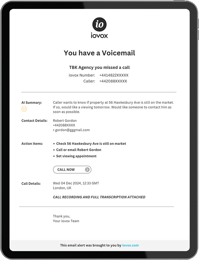 The iovox system distills voicemails into concise and insightful summaries, providing key details and actionable next steps.